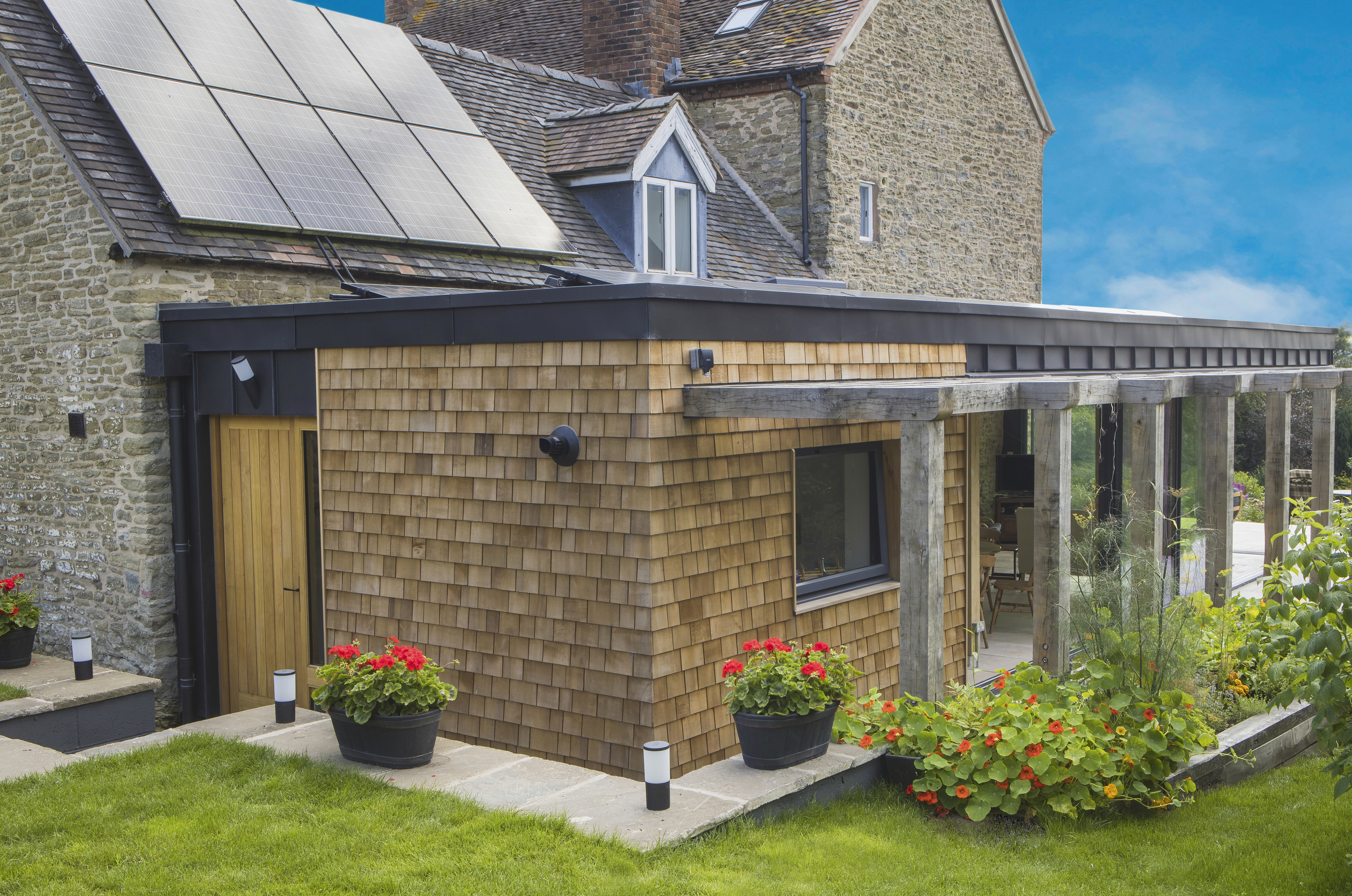 The Roof gas a Parapet cladding in Black Zinc, finished with a Bauder Roof System with Solar Panels installed