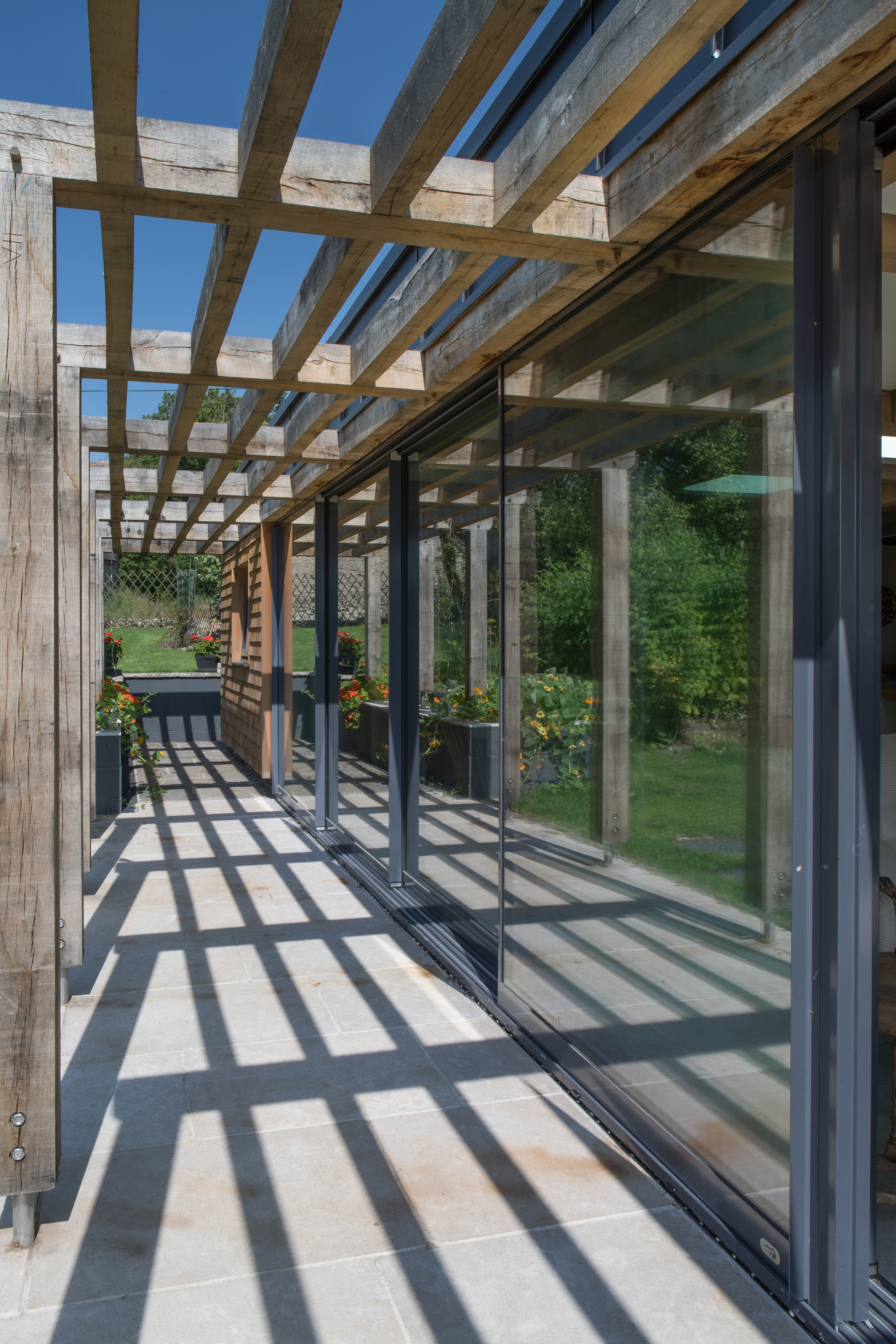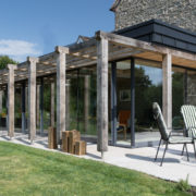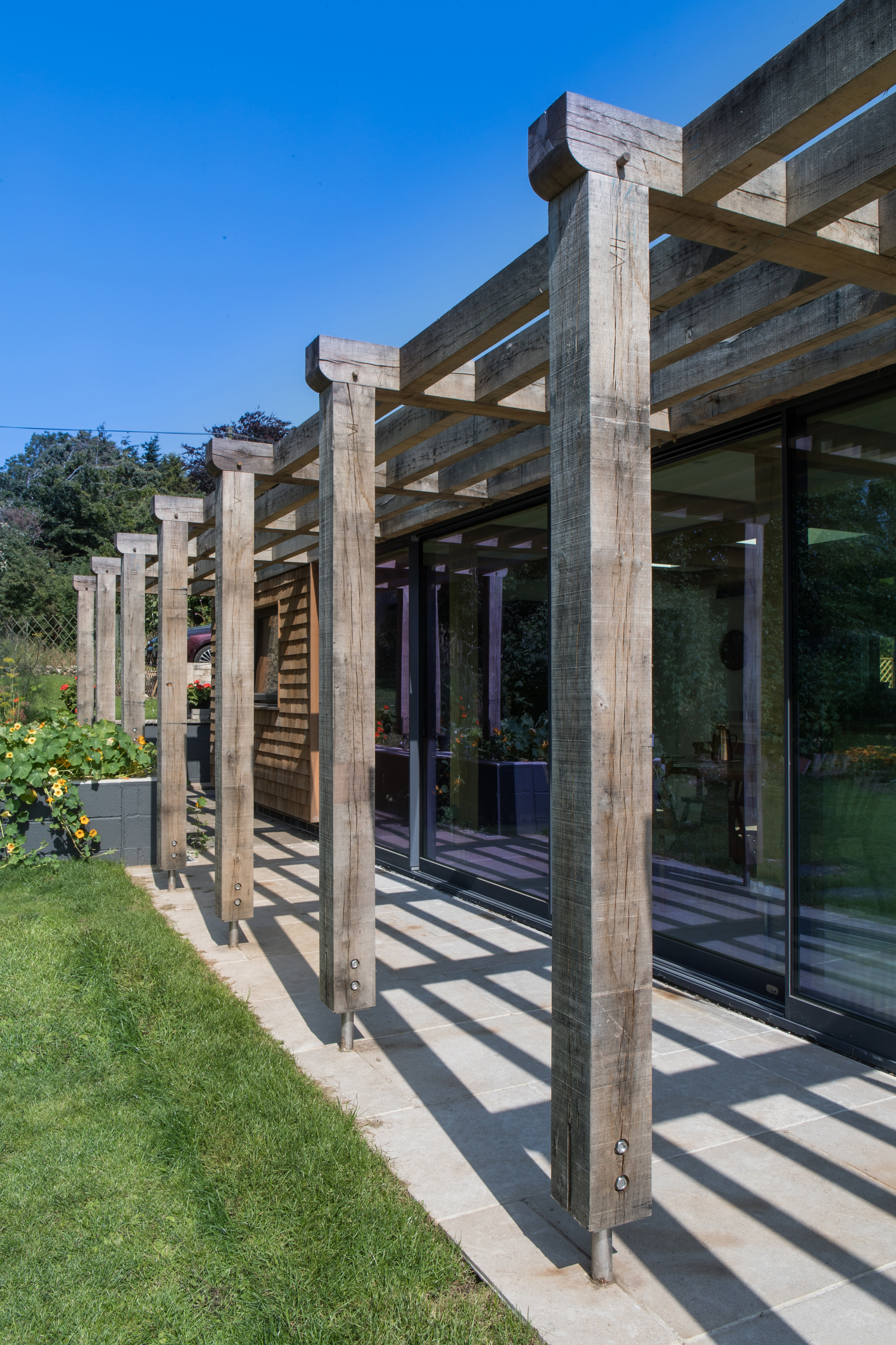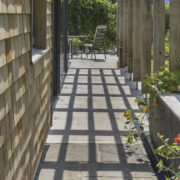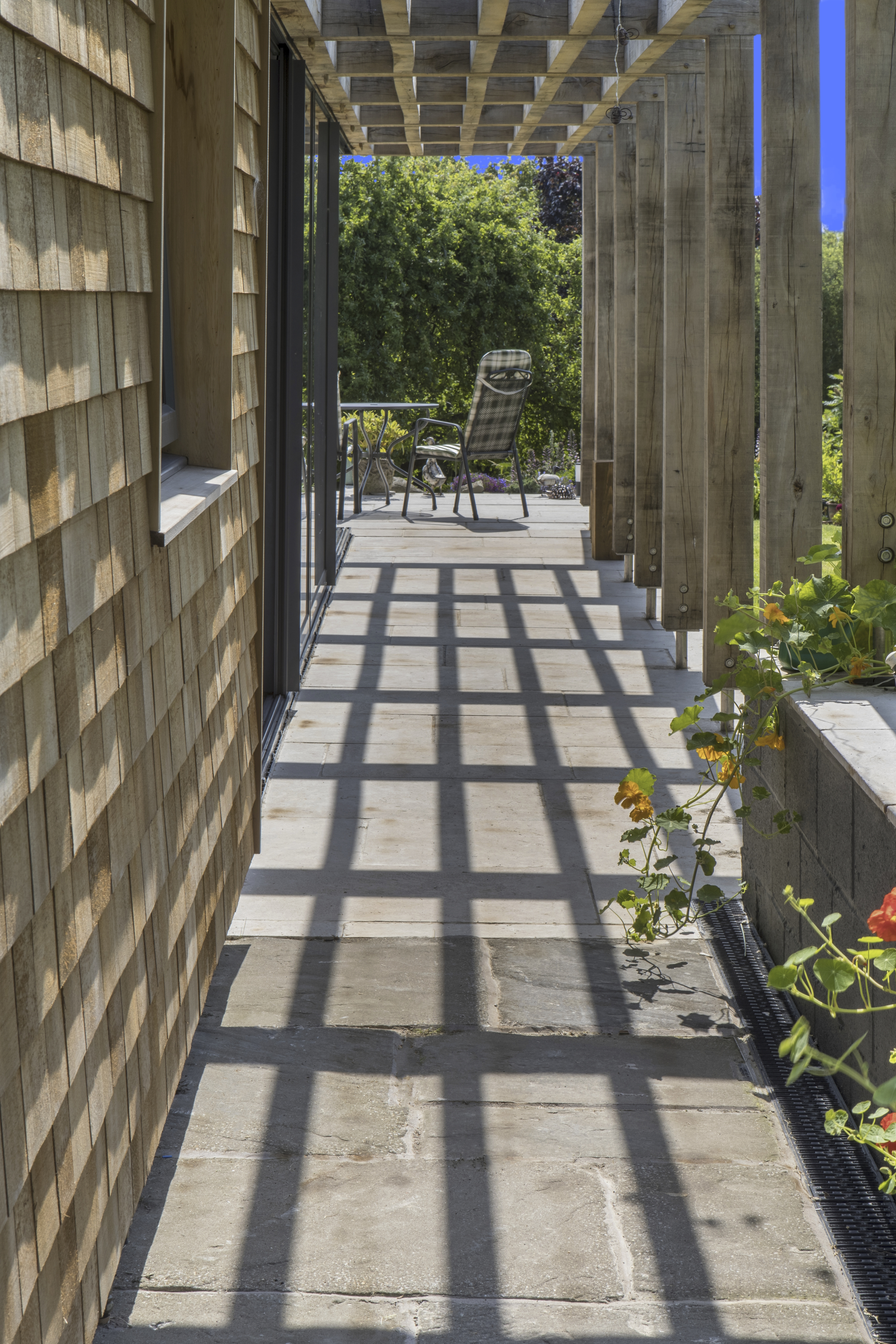 For the Landscaping, Ecoline Building Ltd installed a Pergola structure off the extension on Oak to match internal finishes, Ecoline built a new raised Patio area, with large steps and planters, These were finished with drainage channels to manage the rain water and Limestone Tiles