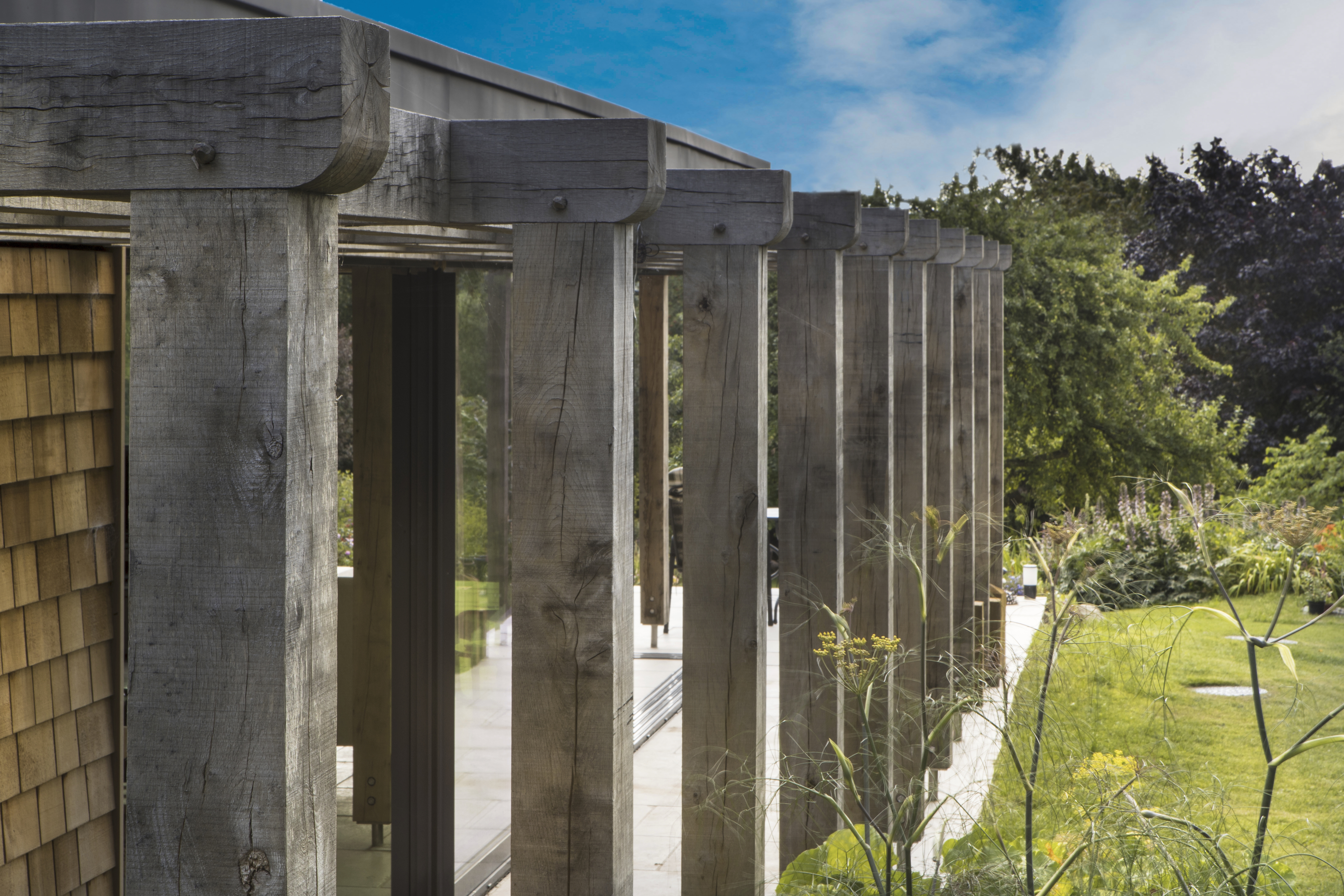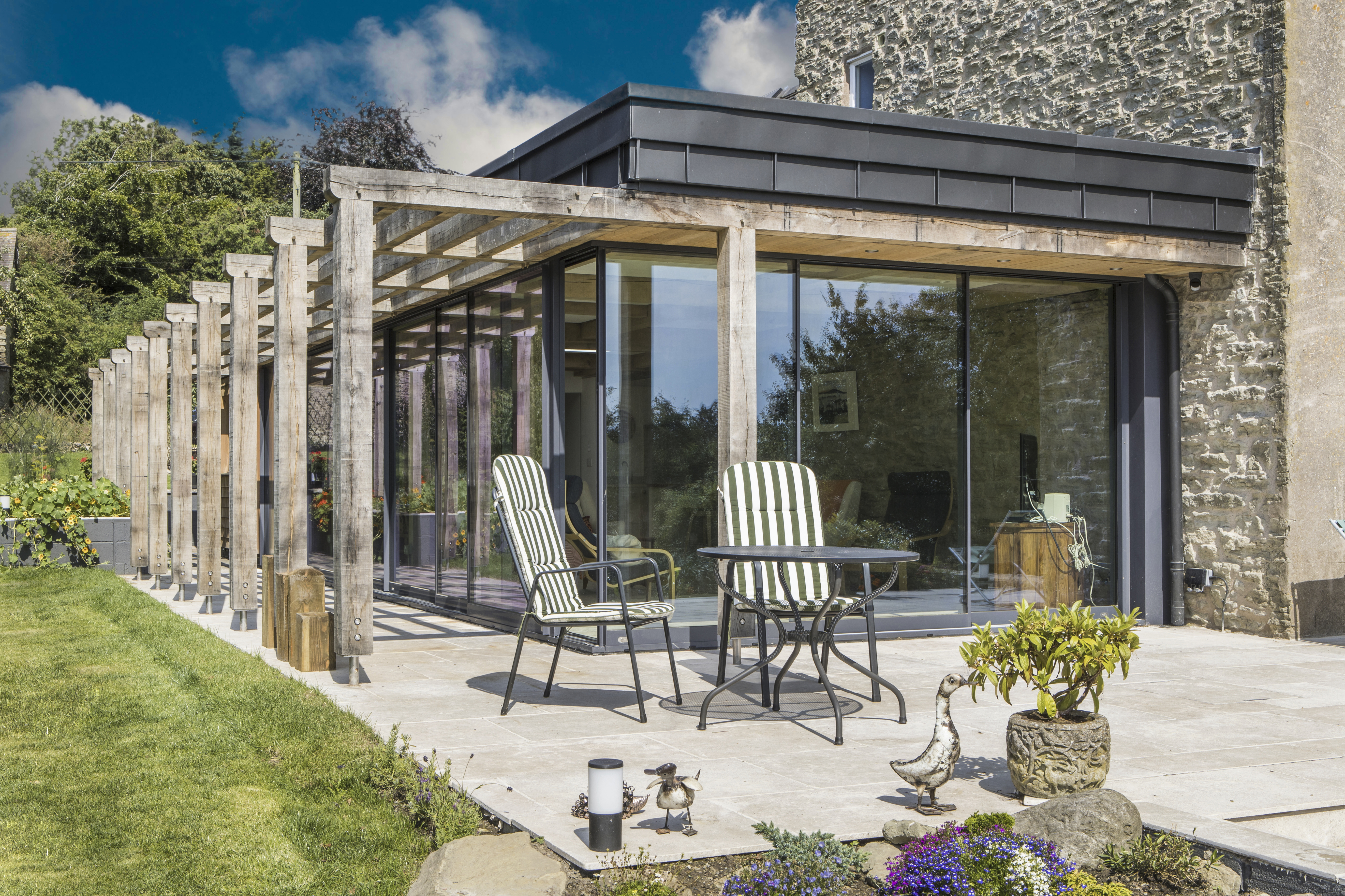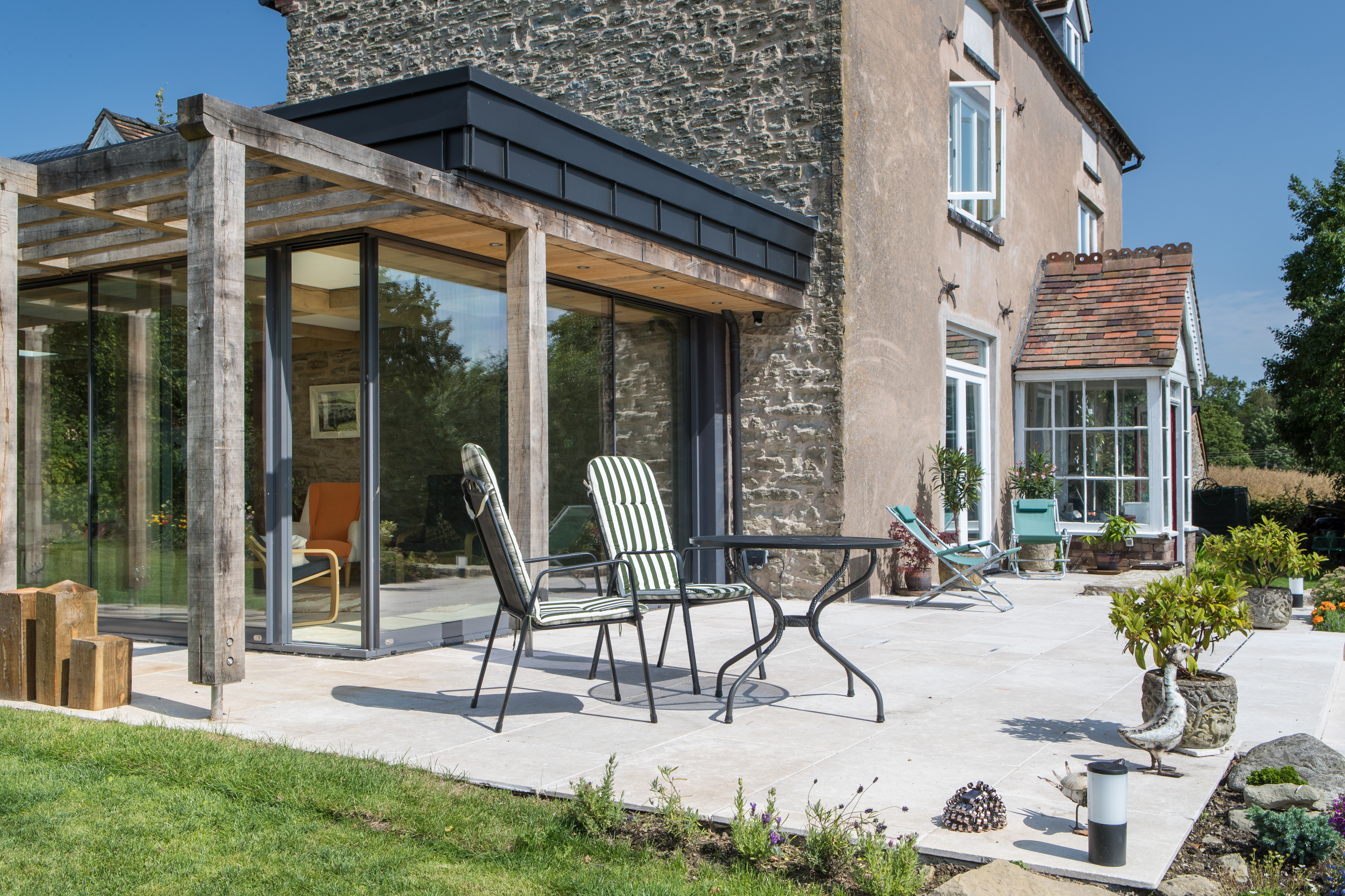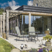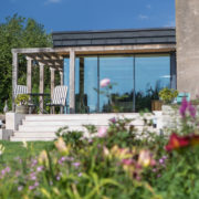 For the Landscaping, Ecoline Building Ltd installed a Pergola structure off the extension on Oak to match internal finishes, Ecoline built a new raised Patio area, with large steps and planters, These were finished with drainage channels to manage the rain water and Limestone Tiles