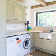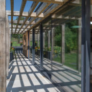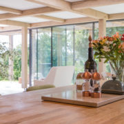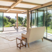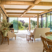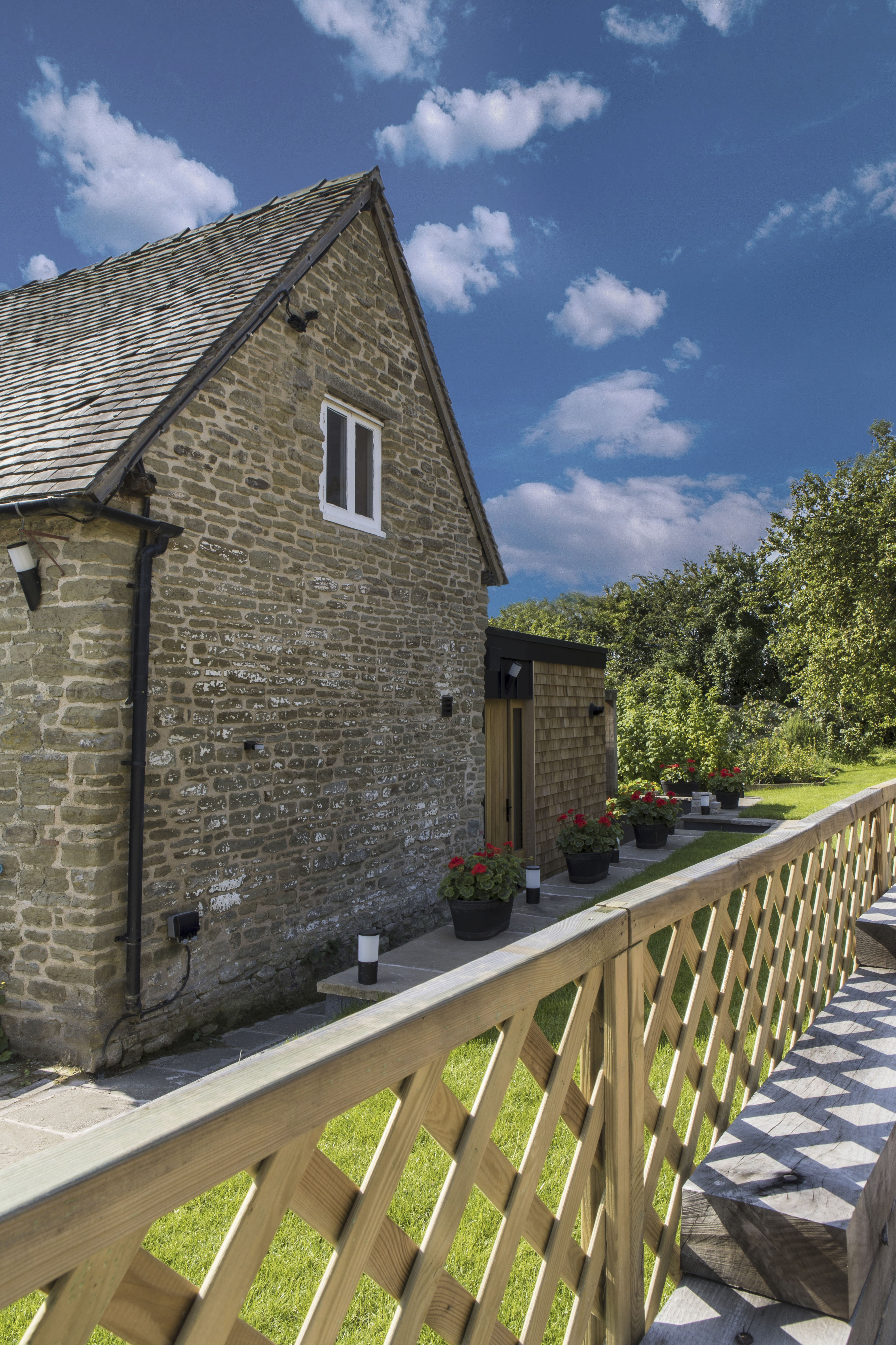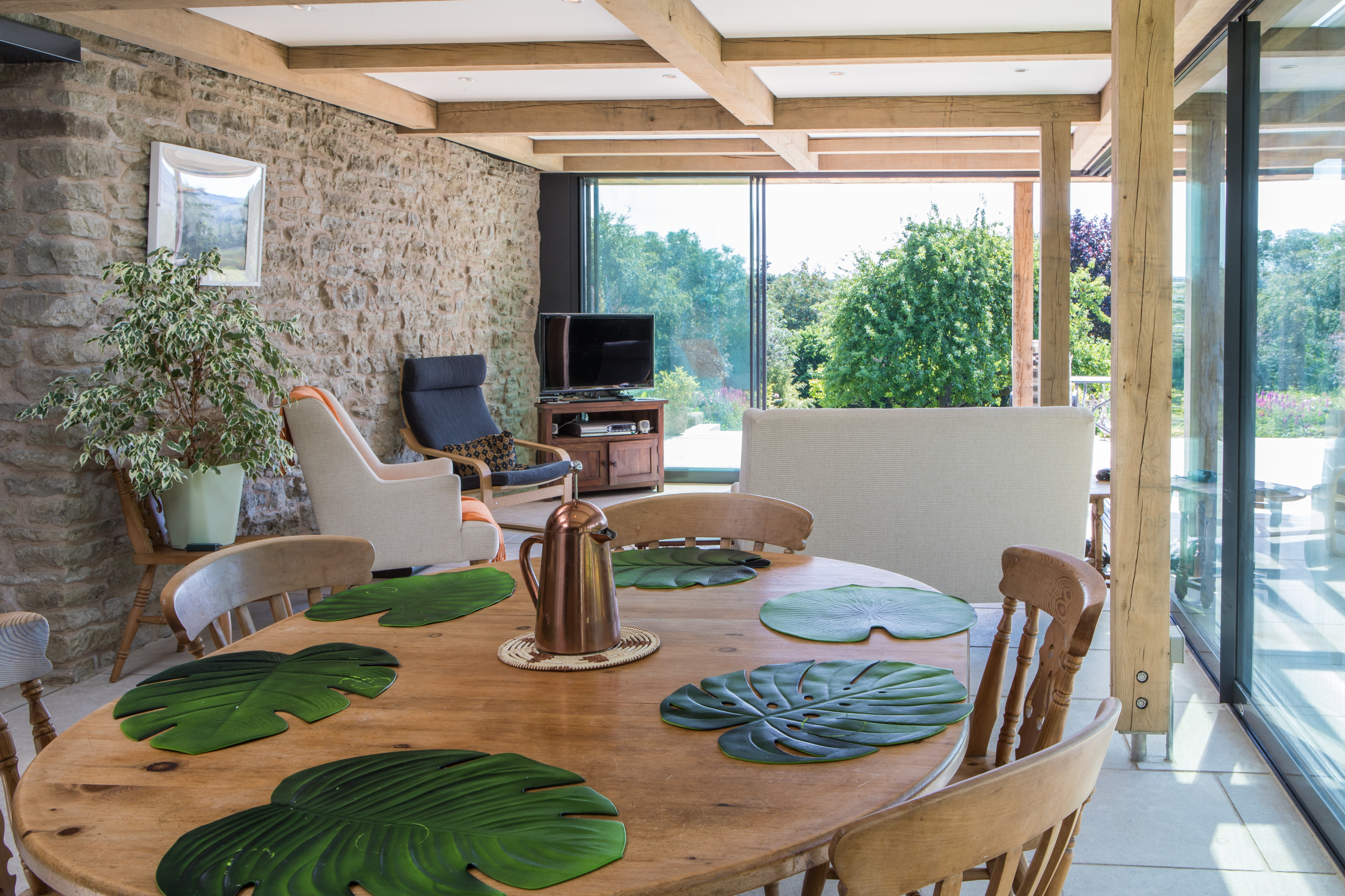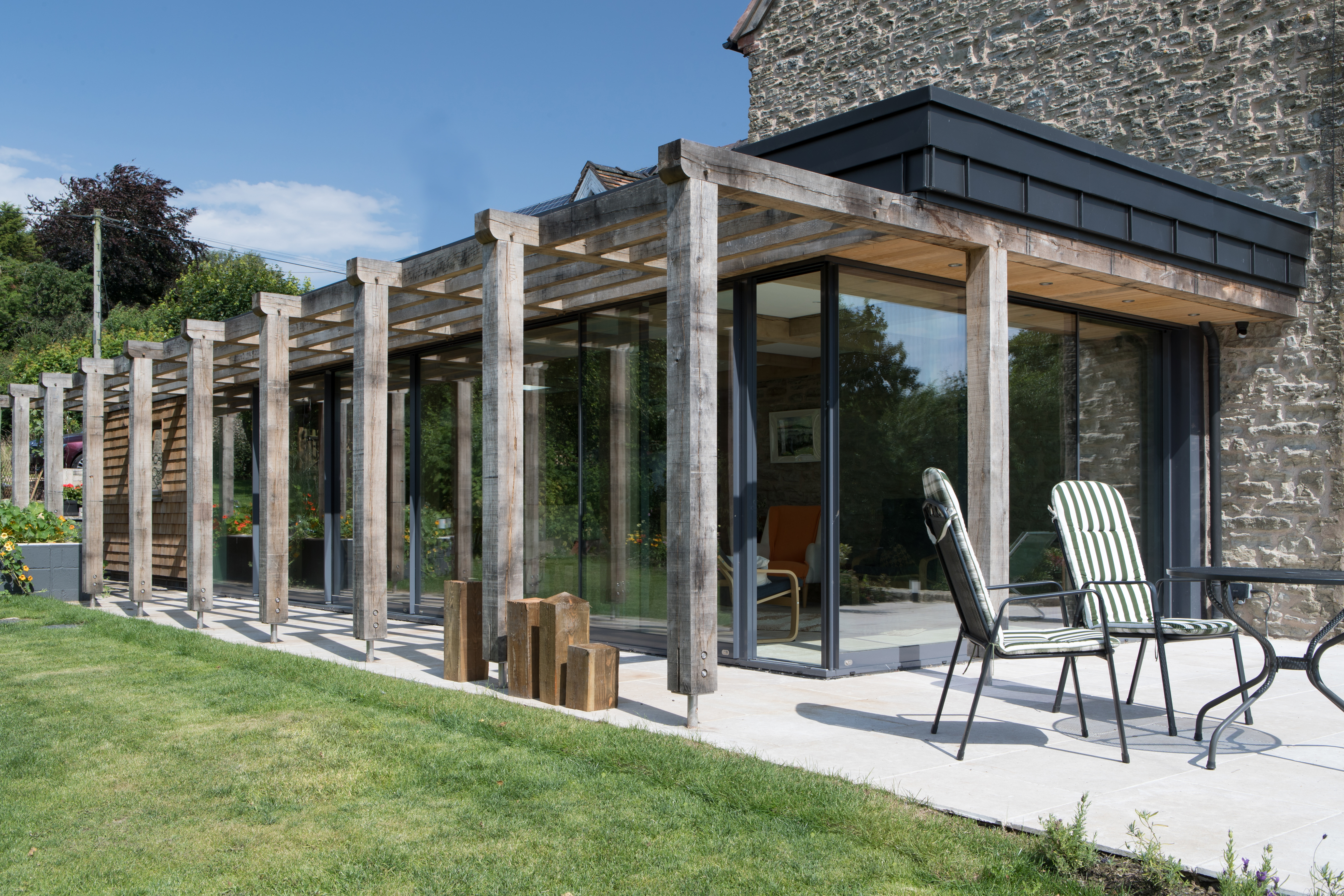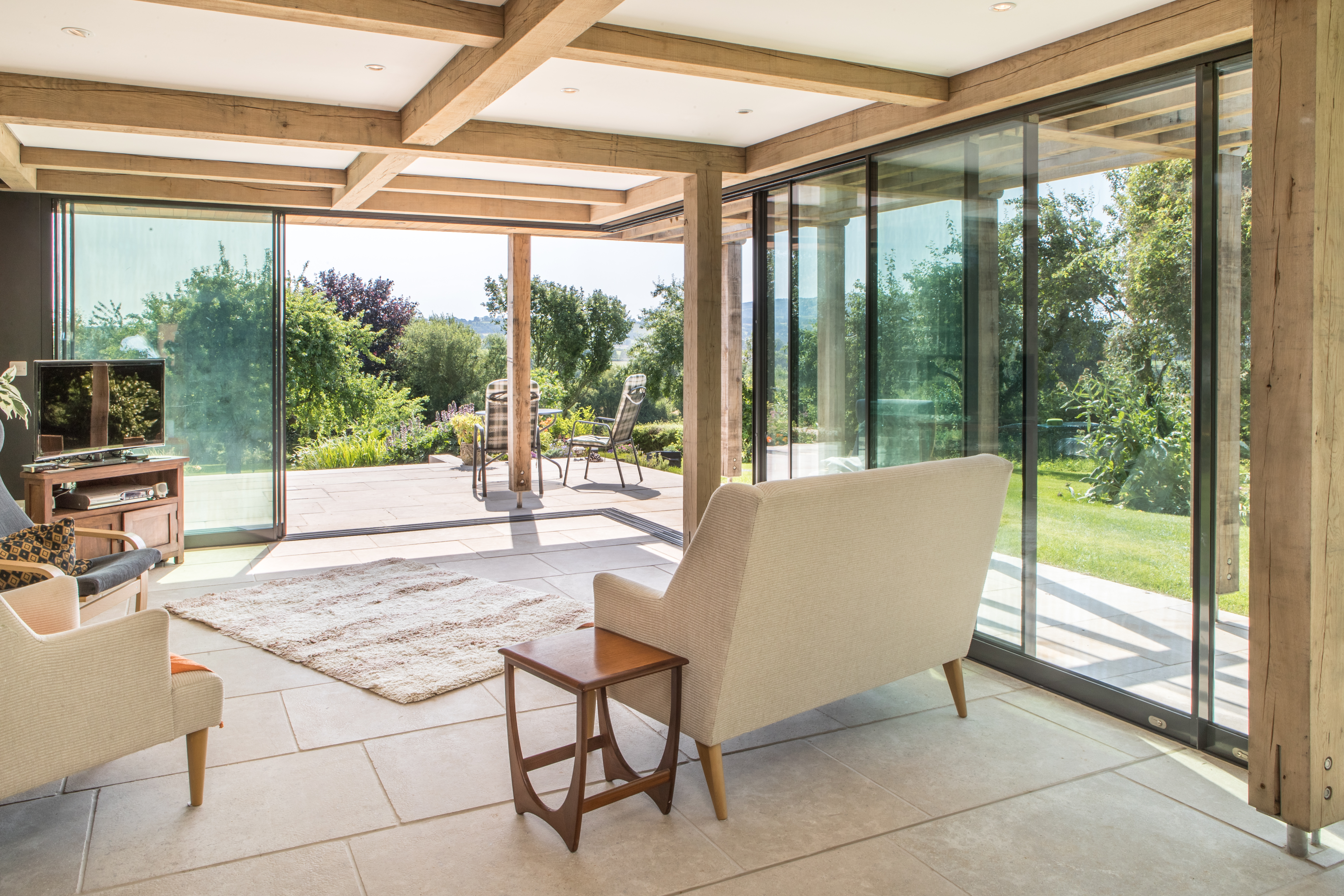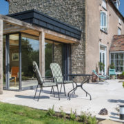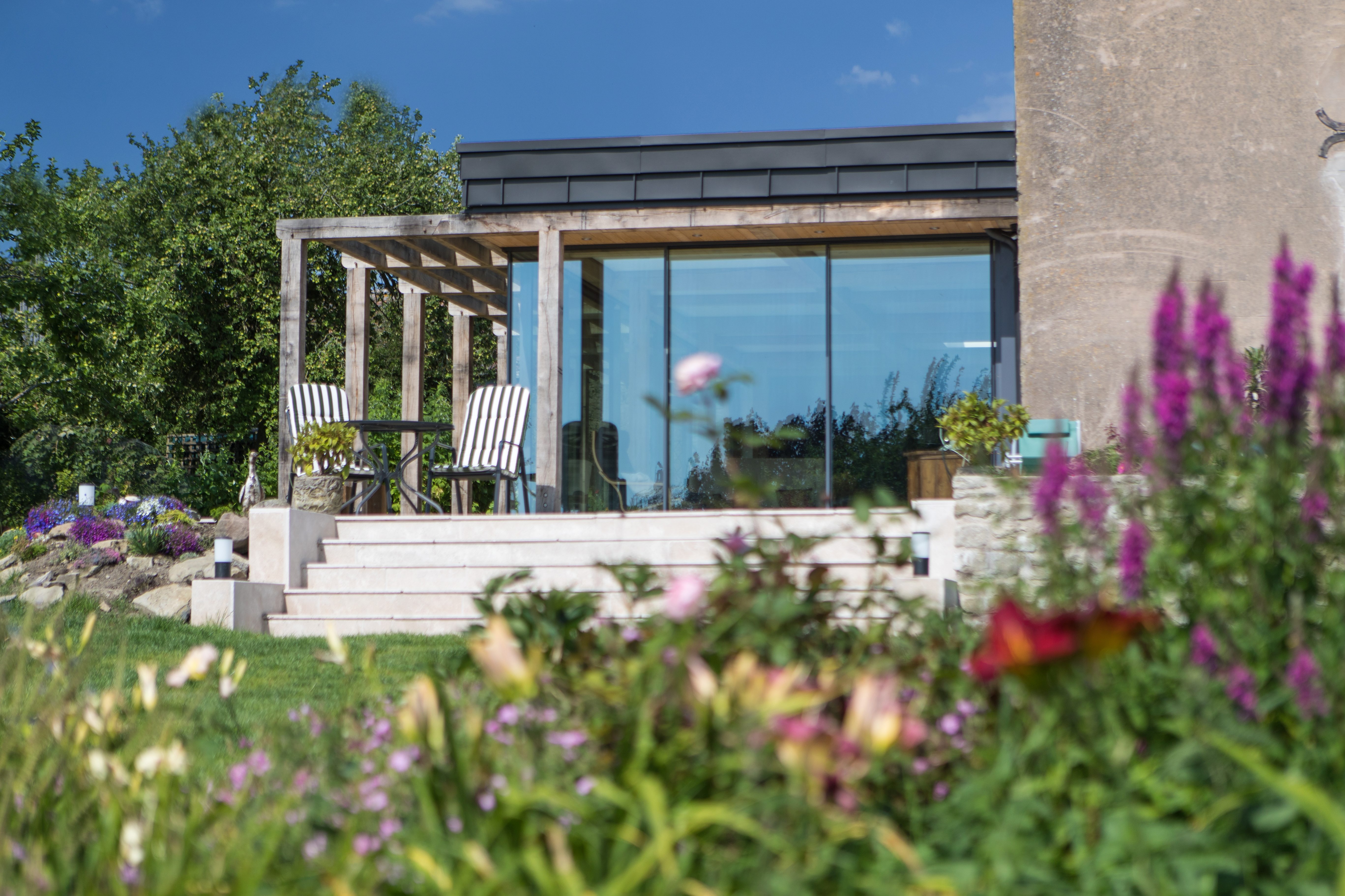 Ecoline Building Ltd completed a contemporary extension on a three-storey stone built farmhouse located near Much Wenlock, working alongside local architects to re model the ground floor, creating a kitchen , diner area, Garden Room, Utility and Shower room with a Aluminium Glazing system that opens up the rear of the house to overlook the garden and views of the surrounding Brown Clee Hill and Countryside.